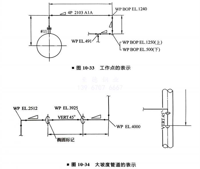 2. 工(gong)作(zuo)點(dian)(dian)(WP)的(de)表示(圖(tu)10-33)對(dui)于(yu)斜管,工(gong)作(zuo)點(dian)(dian)應表示:管道(dao)的(de)拐彎處(chu);界區線(xian)或(huo)接(jie)續線(xian)的(de)交(jiao)接(jie)點(dian)(dian)。