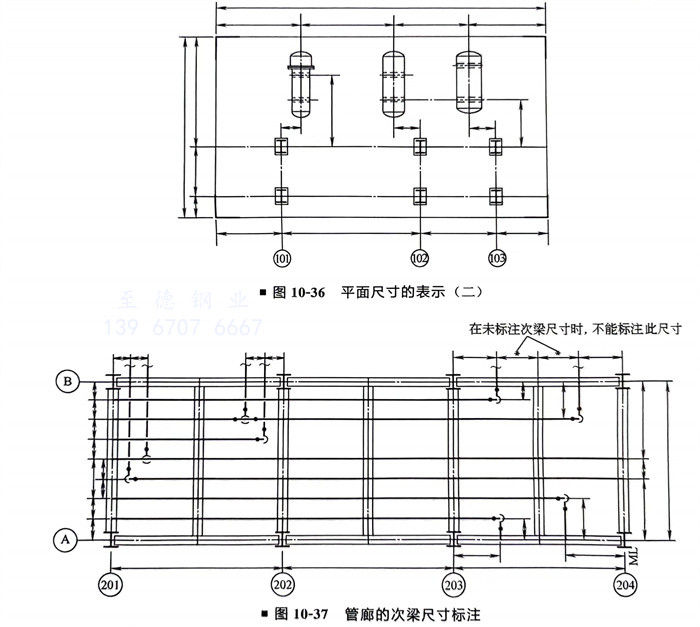 a. 管廊的次(ci)梁尺寸間(jian)距(ju)相等時(shi),則不需(xu)表示,除非管道尺寸從次(ci)梁引(yin)出(chu),則必(bi)須(xu)表示(圖10-37)。